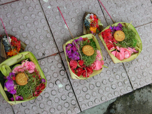 As soon as we arrived in Bali, we noticed small green things on the ground outside of most buildings. A small plate or tray was formed from folding a palm leaf, and on the plate were small bits of food. Mutia explained that they're offerings for the gods, and that the locals put out a fresh one every day. Sure enough, we passed by an offering dish for each stall, and we noticed the different items in each one. Well, we noticed almost all of them. As we were leaving one stall, I felt a sudden splash of warm liquid on my leg, and looked down to find Zoe's foot in one of the offering trays. It turned out to be a small plastic bag of coffee that she'd burst, splashing us both with it. We felt awful about it, but the shopkeeper and her neighbors all laughed it off. We bought something from her out of guilt, and moved on.